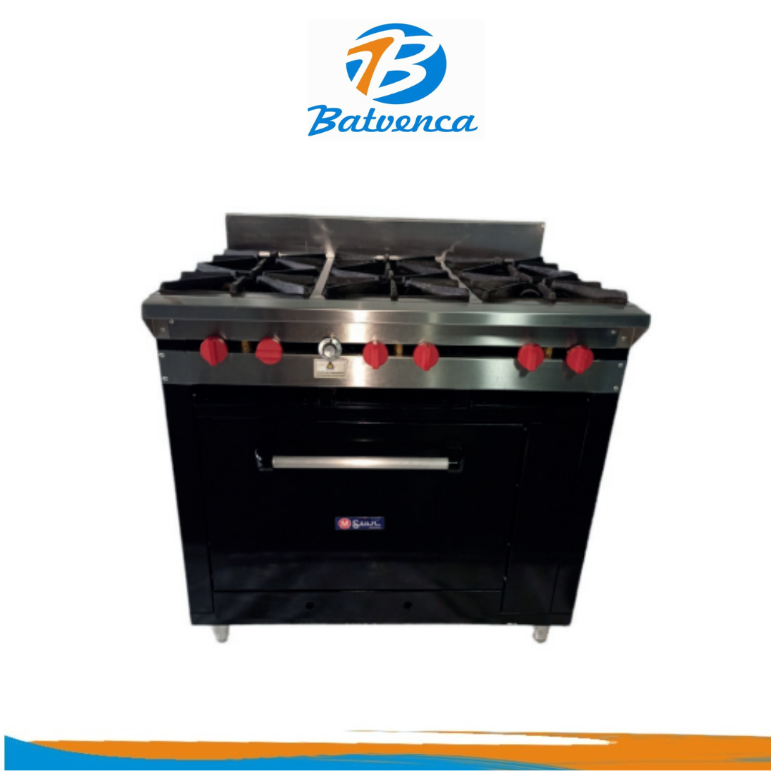 Descripción: Cocina a gas tope y horno en acero inoxidable 430 y estructura en galvanizado pintado, compuesta por 6 hornillas de hierro fundido, plancha con gratinador y horno con porta manopla. Diseñada para ser utilizada en cocinas de restaurantes, hoteles, casinos y otros lugares que se relacionen con la cocción. Se recomiendan para negocios que necesiten realizar varias operaciones distintas (cocinar, hornear y colocar alimentos en la plancha).