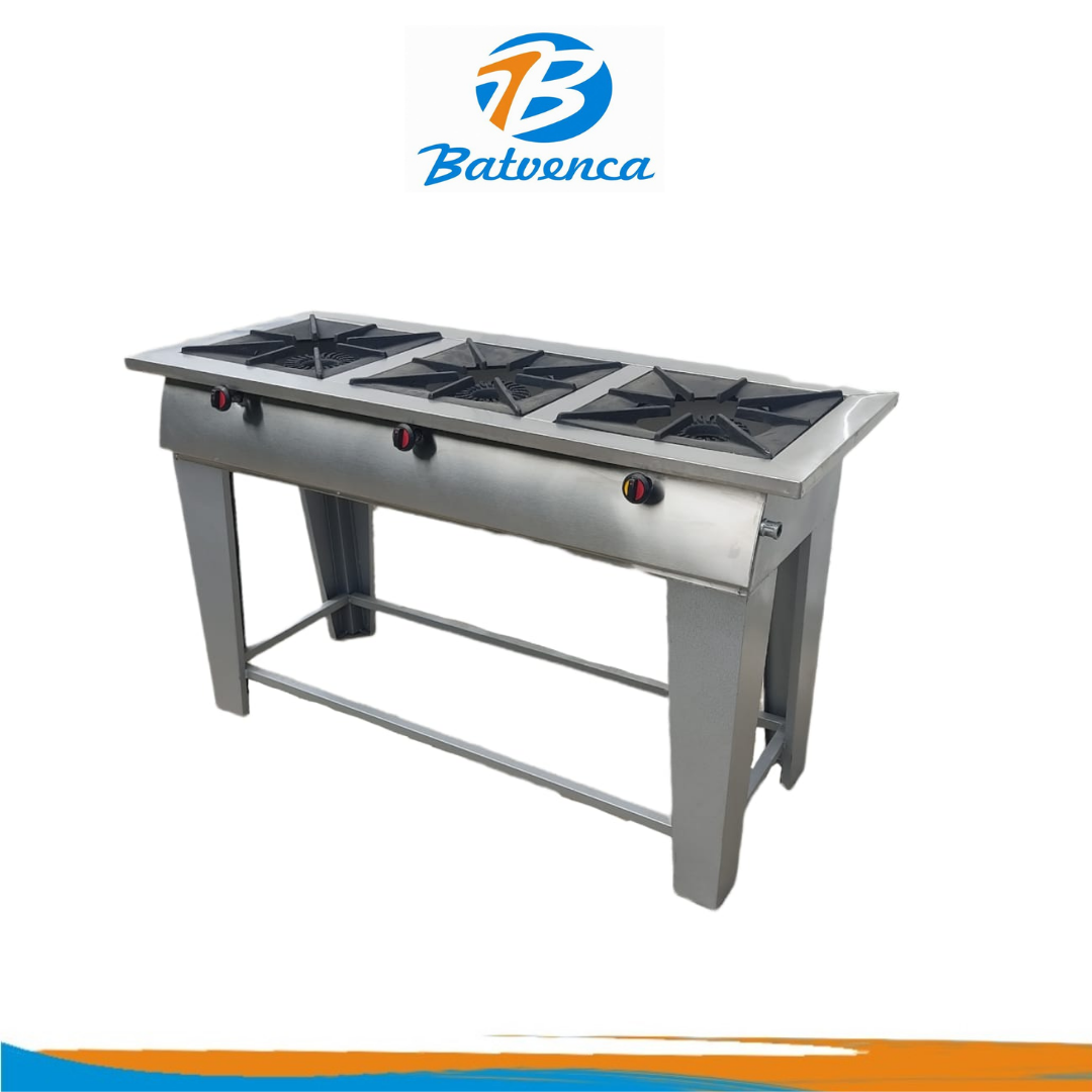 Descripción: Cocina tropical a gas con frente en acero inoxidable 304-4 y cuerpo de láminas pintadas, compuesta por 3 hornillas de hierro fundido. Diseñada para ser utilizada en cocinas de restaurantes y otros lugares que se relacionen con la cocción.