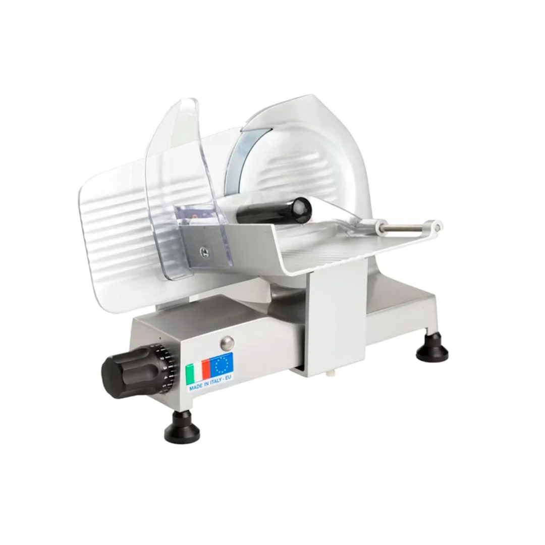 Descripción: Rebanadora charcutera con estructura en aluminio anodizado y disco en acero inoxidable, con bandeja deslizante. Facilita el corte y rebanado de diferentes tipos de embutidos y quesos. Ideales para charcuterías, restaurantes, supermercados y otros.